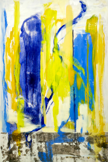 Aus den vielen anfänglichen Skizzen wurden schließlich drei Farbtafeln, die Kühner ihrem Auftraggeber präsentierte: eine sehr konkrete Umsetzung, die zwei Sportler auf dem anthrazitfarbigen Ziegelfundament der Halle in Piktogramm-artiger Weise zeigt, eine halbabstrakte Komposition, auf der die Sportler sich in farbiger Dynamik auflösen, und ein Bild ohne jede Gegenständlichkeit, auf dem lediglich die blauen und lehmgelben Elemente in einen spannenden Wettkampf treten.